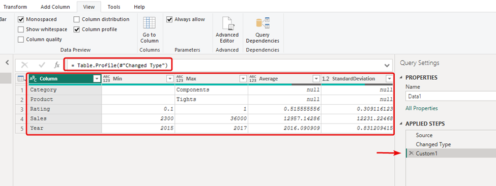 To use it, simply add a new step and use a table as the parameter to Table.Profile Function, which in this case is the previous step #”Changed Type”. This will generate a list of all columns in the table, each in its own row, along with all the statistics.