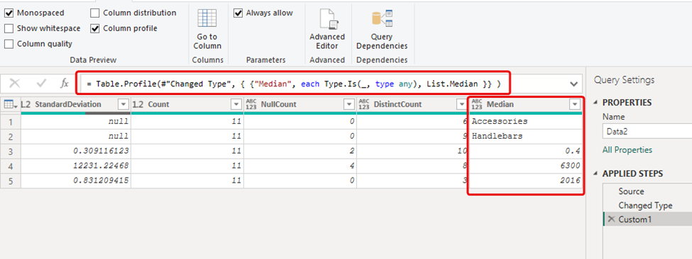 For instance, if you want to find the median of the columns in your table, which isn’t included in the default Table.Profile result, Here, I’ll show you how to add a new column named “Median” using the List.Median function.