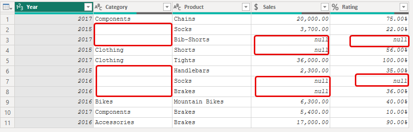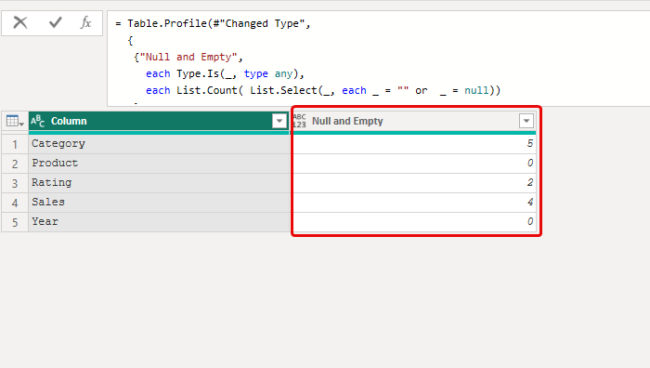 The “category” column contains empty strings, and both the “sales” and “Rating” columns contain null values. While Table.Profile provides details about null values in number columns with “Null Count,” it doesn’t show this information for text columns to display the count of empty strings. Therefore, we’ll create a function to identify these instances and show them in a single column, allowing us to observe both nulls and empty strings together. Let’s create this function to fill this gap.